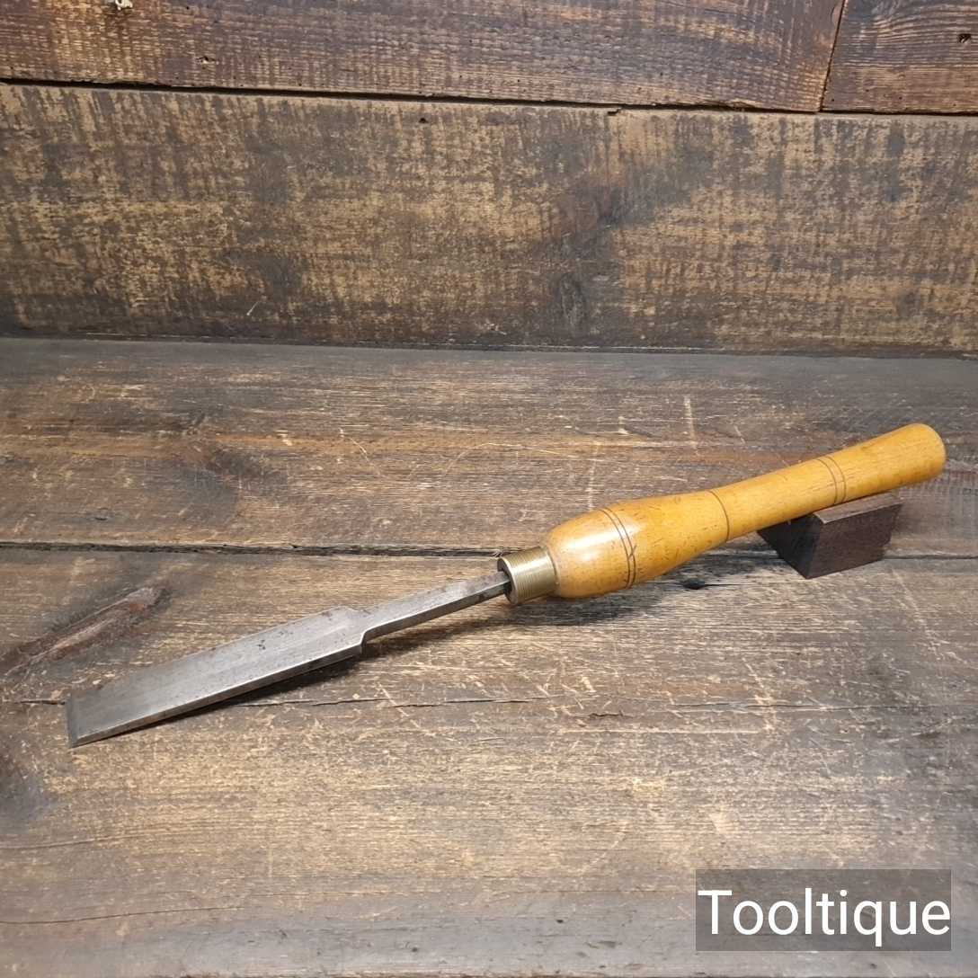Vintage Sheffield 1 ¾” wide woodturning skew flat chisel with beechwood handle in good used condition. Note: rehandling crack resin filled.